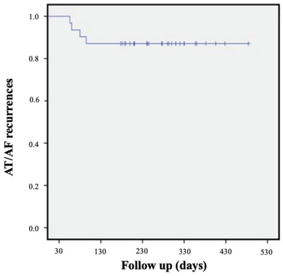 After a mean follow-up of 12 ± 7 months, 27 out of 31 (87%) patients remained free from AT/AF recurrences (Figure 2). Among patients with arrhythmic recurrences (n = four), three presented AF, while one presented AT. In this group, in two cases (50%), the ablation lesion set remained incomplete, and in three (75%), VOM-EI was considered “suboptimal”. In 23/31 patients (74%), AADs were discontinued after a 1-month follow-up. No significant complications were reported during the follow-up (Table 3 and Table 4).