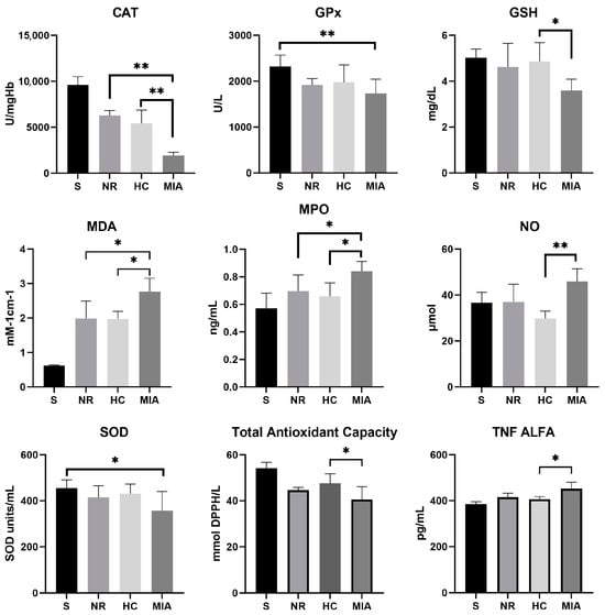 MPO activity increased significantly in the MIA control group compared to Sham rats (p < 0.01). MPO activity was significantly decreased in HC- and NR-treated animals in comparison to the MIA group (p < 0.05), suggesting that NR and HC may play a role in decreasing oxidative stress pro-inflammatory reactions. Nitric oxide levels were greatly reduced in the HC group compared to the MIA and NR groups (p < 0.01), while TAC levels showed a statistically significant difference between the MIA and HC groups (p < 0.05). The levels of TNF-α were increased in the MIA-induced KOA group compared to those in the Sham group. The assessment of TNF-α presented statistically significant results only between the MIA- and HC-treated groups (p < 0.05), suggesting a stronger anti-inflammatory effect of HC compared to NR.