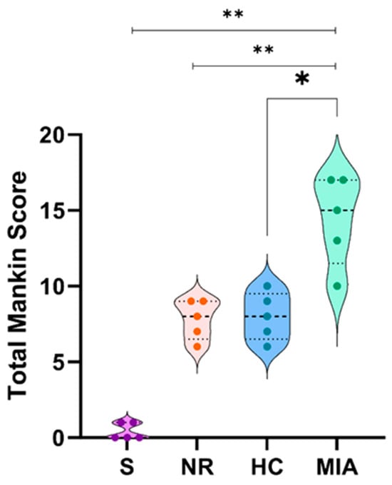 The Mankin score was significantly higher in the MIA-treated group than in the Sham (p < 0.01), NR (p < 0.01), and HC groups (p < 0.05), as shown in Figure 2.