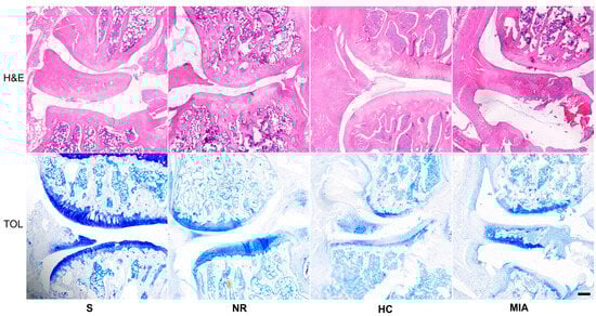 All animals included in this study, except those from the Sham group, exhibited an abnormal histological structure (Figure 3). Regarding the articular cartilage structure, the NR and HC groups presented lesions ranging from surface irregularities to clefts extending to the transitional zone, while the lesions in the MIA group were much more severe and characterized by loss of cartilage in the deep zone. Toluidine blue staining revealed that the NR group presented a lower glycosaminoglycan content in the superficial and middle zones of the cartilage. Animals from the HC group showed a lesser degree of injury, which extended to the upper transitional zone of the cartilage. Rats assigned to the MIA group presented a decreased glycosaminoglycan content in all three regions. The tidemark integrity was affected in all groups except for S. Apart from the criteria that compose the modified Mankin scale used in this study, we have observed meniscal lesions and inflammatory infiltrate concerning both the meniscus and the meniscofemoral and meniscotibial ligaments in the NR, HC, and MIA groups. An inflammatory infiltrate was also present in the synovia. Animals treated with HC or NR showed a lesser extent of lesions compared to the ones from the MIA group (Figure 3).