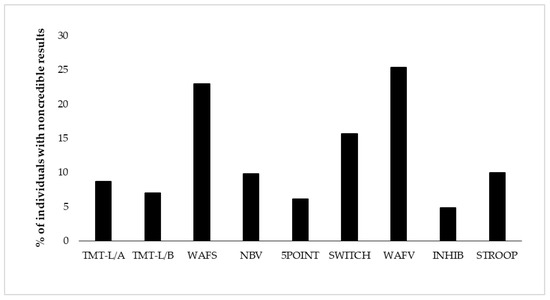 Proportion of individuals showing positive EVI (embedded validity indicator) results per test (i.e., positive EVI (embedded validity indicator) result on at least one of its variables). The order of display represents the test order in the battery. TMT-L/A = Trail-Making Test-L, Part A, TMT-L/B = Trail-Making Test-L, Part B, WAFS = Perceptual and Attention Functions Test-Selective, NBV = N-back verbal, 5POINT = 5-Point, SWITCH = Task switching, WAFV = Perceptual and Attention Functions-Vigilance, INHIB = Go/No-Go test, STPOOP = Stroop interference test.