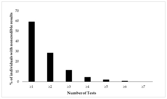 Figure 2 and Figure 3 depict cumulative percentages of positive EVI results per test (Figure 2) and test variable (Figure 3). The distributions indicate that more than half of the participants showed at least one positive EVI result across a test variable or test (in both cases 59%), and about 30% of the sample showed suspect results in at least two EVIs across a variable or test. A minority of the participants (<10%) showed suspect results on four or more EVIs per test or five or more EVIs across test variables.