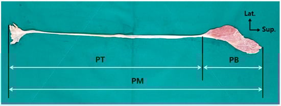 The height was measured in a supine position; the chin was pulled toward the body, the knees were stretched as far as possible, and the ankles were placed in a neutral position. Then, the distance from the top of the head to the tips of the heels was measured. The leg length was measured by using the method of measuring the distance from the anterior superior iliac spine to the tip of the medial malleolus, which was suggested by Gogia and Braatz [], in the same position as that used for the height measurement. The length of the PM was measured by dividing it into the PB and the PT, and the total length was calculated by adding the two length values. The tendon width was measured at the midpoint of the PT. All measurements related to the PM were taken, with the PM remaining intact at its origin and insertion (Figure 1). All lengths were independently measured once each by two researchers. The height and leg length were measured by using a general tape measure (Tajima Tool Corporation, Torrance, CA, USA), and the lengths and widths of the PB and PT were measured with electronic digital calipers (Sincon Corporation, Los Angeles, CA, USA). The unit of measurement for all lengths, including the height and leg length, was 0.1 cm, and the PT width was measured in units of 0.1 mm.