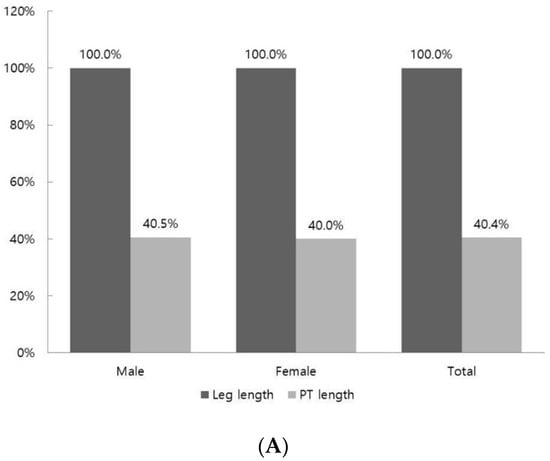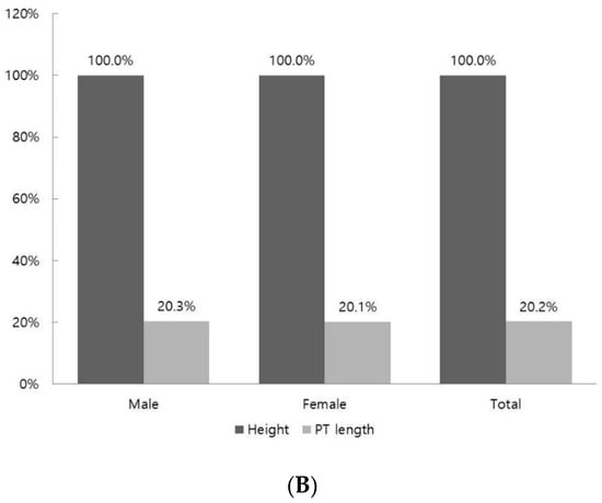The ratio of the PT length calculated based on 100% of the leg length was 40.4%. There was no difference in the ratio according to sex, with 40.5% for males and 40.0% for females (Figure 2A). The ratio of the PT length calculated based on 100% of the height was 20.2%. There was no difference in the ratio according to sex, with 20.3% for males and 20.2% for females (Figure 2B).