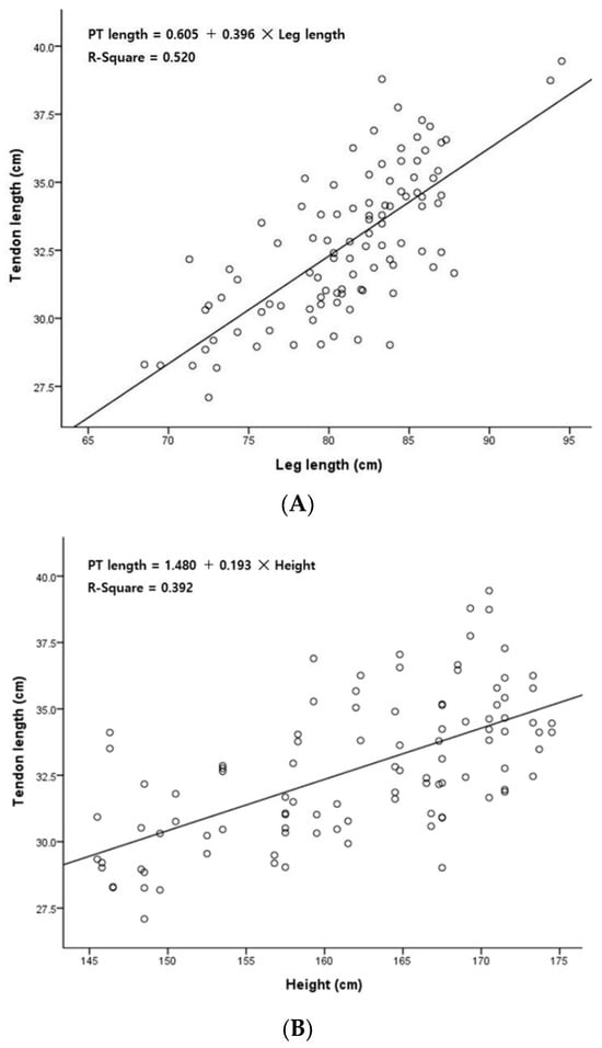 In this study, the correlations between height, leg length, and PT length were analyzed. A positive correlation was established for both height and leg length (p = 0.000). Between height and PT length, the Pearson r value was 0.626, and between leg length and PT length, the Pearson r value was 0.721 (Table 3). As a result of the statistical analysis, the influence of sex and age was very weak or absent, so this could not be a constant predictor. Therefore, a simple plastic regression analysis was performed to calculate a prediction equation that could predict the PT length based on the most influential leg length and height, and the results were as follows. The equation for predicting the PT length (x, cm) based on the leg length (y, cm) variable was PT length = 0.605 + 0.396 × leg length. The equation for predicting the PT length (x, cm) based on the height (y, cm) variable was PT length = 1.480 + 0.193 × height. These results are thought to help decide whether to implement a tendon graft by using the PT in clinical practice (Table 5).