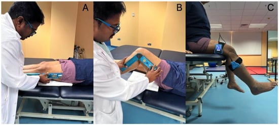 A Baseline® Absolute+Axis® Digital Goniometer, Fabrication Enterprises, Elmsford, NY, USA measured ROM for knee flexion and extension. The participants were put in a comfortable supine position. They were given a 2 cm thick rubber cushion to place beneath their thighs, allowing their knee extension to be evaluated more easily. The therapist placed the lateral knee aspect with a digital goniometer with a precision of 0.1°. The goniometer touched the patient’s skin, and the stable arm was parallel to the thigh. The fulcrum was at the knee joint line, and the movable arm was along the midline of the leg. The therapist held the goniometer firmly, as shown in Figure 1. The participants were asked to bend and flex their knees actively, and the angles of their full range were recorded in degrees. Each ROM measurement was performed three times, and an average of the three measurements was considered for final analysis [,].