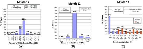 - Reitblat, O.; Gershoni, A.; Mimouni, M.; Vainer, I.; Livny, E.; Nahum, Y.; Segev, F.; Bahar, I. Refractive outcomes of high-magnitude astigmatism correction using femtosecond LASIK versus transepithelial PRK. Eur. J. Ophthalmol. 2021, 31, 2923–2931. [Google Scholar] [CrossRef]