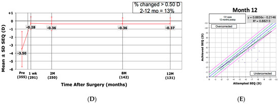 | Parameter | Sphere (Mean Diopter ± SD) | Cylinder (Mean Diopter ± SD) | SE (Mean Diopter ± SD) | UDVA (Mean ± SD) | BCDVA (Mean ± SD) |