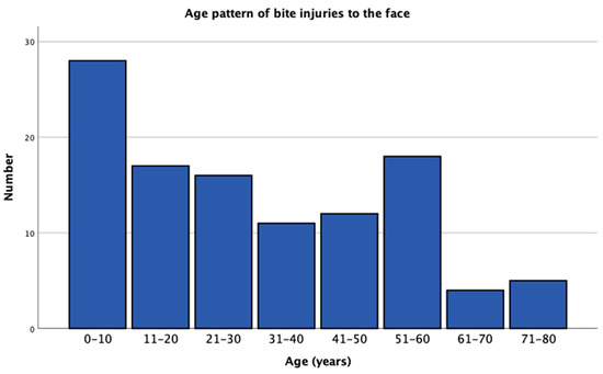 Table 2 shows the base data of the entire cohort. A total of 59 female and 52 male patients underwent treatment for animal bite injuries to the face from 2009 to 2022 in our unit. The mean age was 30.30 ± 21.50 years (range 1–76 years). A total of 28 patients were 10 years or less (25.2%) and represented the dominant age band (Figure 1). In 105 cases (94.5%), bites were caused by dogs, in 5 cases by horses (4.5%) and in one case by a fox (0.9%). Only female patients sustained horse bites (p = 0.032). A total of 64% of the involved animals (n = 71) were familiar to the victims. In 18.0% of the involved dogs, complete vaccination status including rabies was documented (n = 20), and in 82.0% of cases, the animal´s vaccination status was unknown (n = 91).