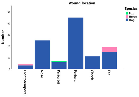 The most common site was the perioral region (40.5%), followed by the nose (22.5%) and the ear (17.1%). This is basically consistent with other studies [5,20,21] and may be caused by their exposed location. Horse bites mainly addressed the periauricular and frontotemporal area, whereas injuries especially in the perioral and nasal tissues were exclusively caused by dogs (p < 0.001). This might result from the different directions of the attacks. Dogs commonly attack from the bottom up, so the victim’s perioral tissue is more reachable for them. Horse bites were exclusively noticed in female patients (p = 0.032) as, in our region, the most common contact with horses originates from horseback riding.