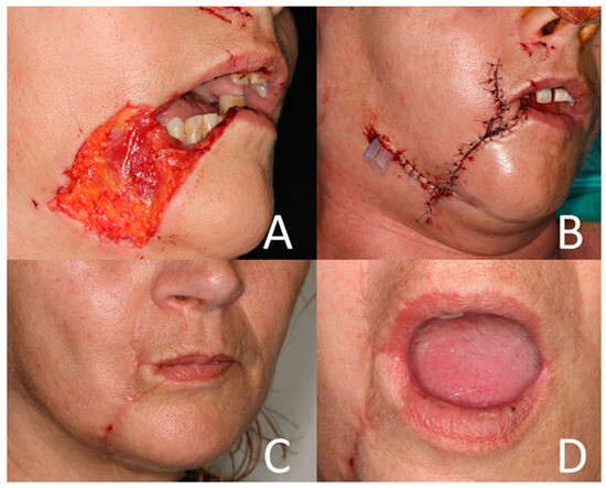 (A) Lackmann type III bite injury after a dog attack. (B) Local flap reconstruction. Drain installed at lateral wound site. (C) Situation 3 months after surgery. (D) Mouth opening 3 months after surgery.