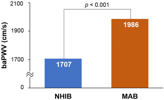 The flow chart for study enrollment is shown in Figure 1. Baseline clinical characteristics of this study population, both before and after 1:1 propensity score matching, are shown in Table 1. Before matching, a total of 8647 subjects were analyzed, comprised of 7879 subjects in the NHIB group and 648 in the MAB group. Beneficiaries in the MAB group were older than those in the NHIB group, with average ages of 64.7 ± 12.2 years and 59.9 ± 12.4 years, respectively (p < 0.001). The MAB group had higher systolic blood pressure and a greater number of risk factors, including diabetes mellitus, hypertension, and cigarette smoking, compared to the NHIB group (p < 0.05 for each). The NHIB group had more prescriptions for calcium channel blockers and RAS blockers, whereas beta-blockers were more commonly prescribed in the MAB group. When 1:1 matching was performed with 633 subjects in each group, the differences in these clinical factors between the two groups were eliminated. The clinical characteristics of this study subjects after matching are also detailed in Table 1. In the matched set of study subjects (n = 1266), the MAB group had a significantly higher baPWV value than the NHIB group (1985 ± 496 vs. 1706 ± 385 cm/s; p < 0.001) (Figure 2).