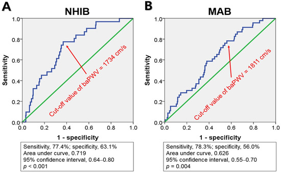ROC curve analysis indicated that the cut-off values of baPWV for predicting MACE were 1734 cm/s for NHIB and 1811 cm/s for MAB, respectively (Figure 3).