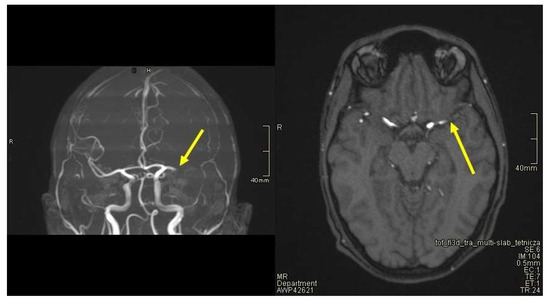 Suddenly, during the administration of IVIG in the evening on the third day of hospitalisation, the boy developed dysarthria and drooping of the corner of the mouth on the right side. Dysarthria is defined as a speech disorder resulting from injury of the motor component of the motor-speech system and is characterized by poor articulation or pronunciation of phonemes and words. The patient involuntarily urinated, and he was sleepy and confused. On examination, there was muscle weakness of the right upper and lower limb, absence of tendon reflexes and central paresis of the VII nerve on the right side. Meningeal signs were negative. Cultivation tests revealed no bacteria in blood culture. Due to the suspicion of ischaemic stroke, magnetic resonance imaging (MRI) of the head was performed together with MRI angiography (Figure 1 and Figure 2).