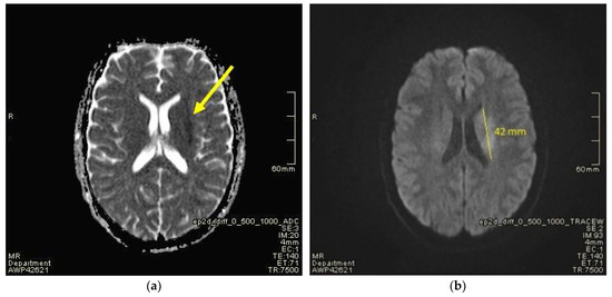 Ischemic strokes involving the corona radiata and lenticular nuclei on the left side. Measurement of AP (anteroposterior) dimension was about 42 mm—changes visible only in the ADC (a) and DWI (b) sequence. Yellow arrow (a) and measurement line (b) represent described changes.