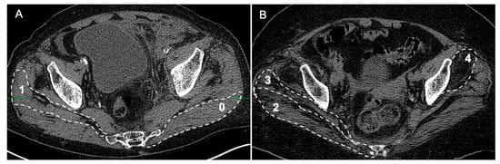 Examples of gMFA with different severities according to Goutallier grading scores based on CT pelvis images. (A) The area marked with 0 is an example of a score of 0 with no fat in the gluteus maximus, which was rare in the investigated population. The gluteus medius marked with 1 represented a score of 1 with intramuscular fatty steaks. (B) The area marked with 2 exemplified a score of 2 in gluteus maximus with mild atrophy, in which the proportion of fat infiltration was less than that of muscle. Nearby, an exaggerated fat infiltration could be found in the gluteus medius, marked by 3, where the proportion of fat and muscle were subjectively equal. The gluteus minimus, marked by 4, showed the most profound fat infiltration, where fat infiltration exceeded in quantity.