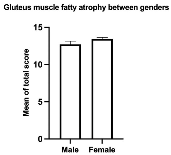 There was no significant difference in the total score of gMFA between genders (male 12.70 ± 4.27, female 13.44 ± 4.05, p = 0.23, Figure 2). The severity of each component of the gluteal muscles was evaluated (Figure 3). The score of gMFA was significantly higher (p < 0.001) in the gluteus medius (left: 2.34 ± 0.89, right 2.33 ± 0.97) compared to the score of gluteus maximus (left: 1.44 ± 0.65, right: 1.52 ± 0.76). The severest gMFA was found in the gluteus minimus (left: 2.87 ± 1.01, right: 2.79 ± 1.02, p < 0.001). No difference was found between the two sides.