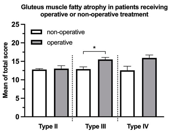 Mean comparison of gMFA using the total score between patients receiving operation and conservatively treated patients in type-II, type-III, and type-IV FFP. Mean ± standard error of the mean. Patients diagnosed with type-III FFP who underwent operative treatment exhibited significantly more pronounced gluteal fatty atrophy than those undergoing non-operative treatment. * p < 0.05. The analysis of type I was not performed because there was only 1 case operated.