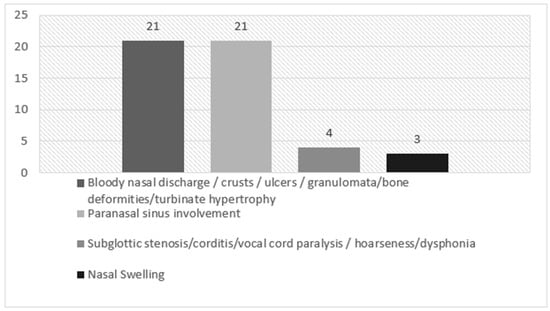 More in detail, medical records and ENT consultation were also examined for the following features: epistaxis, nasal swelling, rhinorrhea, turbinate hypertrophy, nasal septum perforation, saddle nose, nasal bone deformities, eosinophilic rhinitis, subglottic stenosis, corditis, vocal cord paralysis, hoarseness/dysphonia, hearing loss, tympanic membrane changes, otorrhea and chronic rhinosinusitis with and without nasal polyposis (CRSwNP and CRSsNP, respectively).