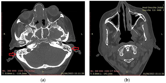 Head CT scan. (a) Total obliteration of the mastoid cells (red arrows) by a hyperdense phlogistic tissue. Total obstruction of sphenoidal and subtotal obstruction of etmoid sinuses; (b) hypertrophy of the maxillary sinus mucosa. Absence of the right inferior turbinate (asportation by previous surgery).