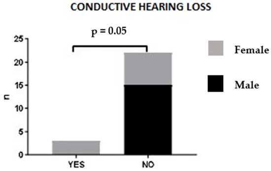 No statistically significant correlation was found between sex, age at diagnosis or ANCA status and ENT clinical manifestations. A trend was observed between sex and ENT involvement: in our patient cohort, hearing loss was associated with female sex. Indeed, male patients did not present this ENT manifestation at the time of diagnosis (p = 0.052) (Figure 4). Upon logistic regression analysis, no association was found between patients’ clinico-pathological features and ENT manifestations.
