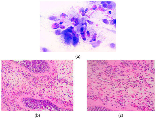 (a) Eosinophils with abundant degranulation are observed in the nasal citology findings in a patient with eosinophilic rhinitis (May Grunwald-Giemsa (MGG), 1000×); (b,c) histological image of nasal polyp with eosinophilic infiltration at various magnifications (20× and 40×).