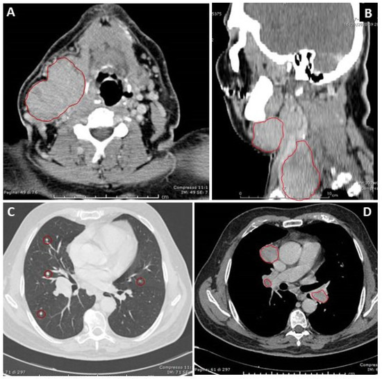Representative images of contrast-enhanced total body CT: (A) Multiple confluent nodular lesions in right latero-cervical region, of overall size 56 × 58 mm, reaching superficial structures of neck and invading peri-thyroid muscles. (B) The nodular lesion in supraclavicular region (47 × 35 mm) invading muscles, causing compression and likely invasion of the internal jugular vein, and displacing anteromedially the right common carotid artery. (C) Multiple metastatic nodular lesions at midfields of lungs bilaterally. (D) Ilo-mediastinal lymphadenopathies (largest of 33 × 37 mm).