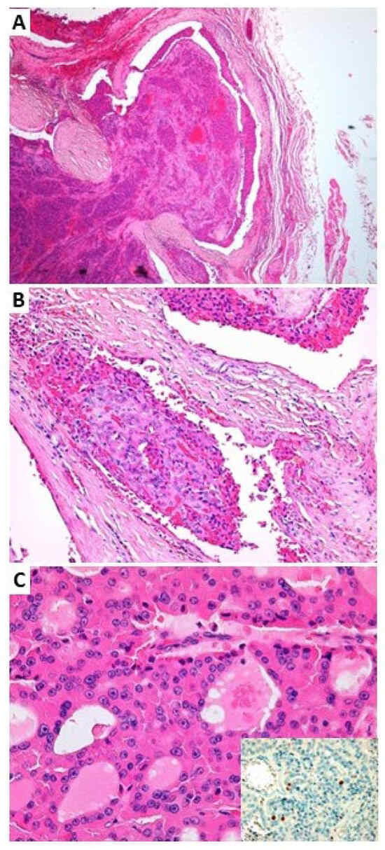 Representative histopathological images of widely invasive oncocytic thyroid carcinoma. (A) In this field, the neoplasm invades the entire thickness of the tumor capsule (hematoxylin and eosin (H&E) staining, original magnification ×40). (B) A focus of vascular invasion is shown (H&E, original magnification ×200). (C) At major magnification, the neoplasm is composed of oncocytic cells with follicular architecture; the neoplastic cells have oxyphil cytoplasm and large centrally located nuclei with prominent nucleoli (H&E, original magnification ×400). In the insert, the proliferative activity, evaluated by immunohistochemistry for Ki-67, is about 3%.