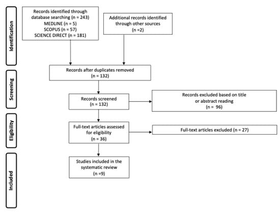 We retrieved 243 articles from the search strategy. Two additional records were identified through a manual search of the references cited. After the removal of duplicates (n = 113), 96 records were excluded based on titles and abstracts. The remaining thirty-six full-text articles were assessed for eligibility and at last nine articles met the criteria for data extraction. The flowchart of the study selection is shown in Figure 4.