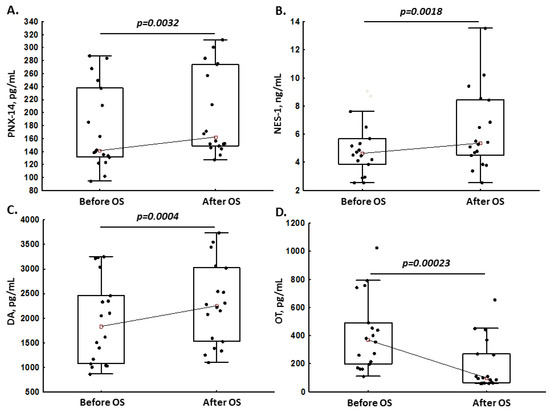 Compared to baseline, in pregnant women, levels of PNX-14 (+14.8%; Figure 1A), NES-1 (+15.7%; Figure 1B) and DA (+22.8%; Figure 1C) increased after OS, while OT decreased by 73% after OS (Figure 1D). In non-pregnant women, the median levels of all neuropeptides remained unchanged after OS (all p > 0.05, Table 2).