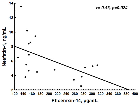Solely in pregnant women, a negative association between NES-1 and PNX-14 (r = −0.53; p = 0.024) was observed (Figure 2).