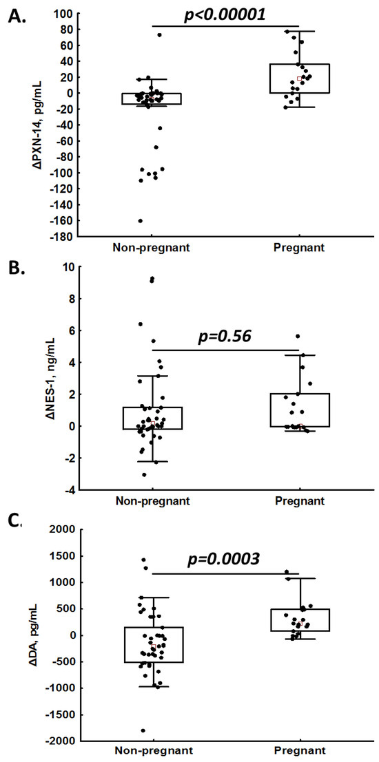Intra-patient changes (Δ) in phoenixin-14 (PNX-14; panel (A)), nesfatin-1 (NES-1; panel (B)) and dopamine (DA; panel (C)) levels in non-pregnant and pregnant women.