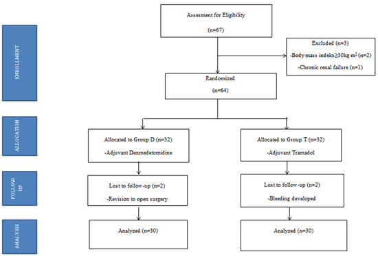 The purpose of adding dexmedetomidine (Sedadomid®, Kocak Farma, Istanbul, Turkey) or tramadol (Ramadex®, Haver, Tekirdag, Turkey) as an adjuvant to the local anesthetic is to observe the effect on the analgesic duration. According to the results of previous similar studies on this subject [15,16], at least 30 patients were required to detect a significant difference between the groups in terms of 180 min analgesia duration with a power of 80% and an α error of 0.05. Considering the patients who might be excluded from the study, the study started with 67 patients.