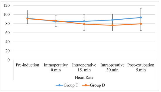 When the groups were compared in terms of intraoperative heart rate, it was found that there was no statistically significant (p > 0.05) difference between the groups until the 30th minute, and the intraoperative 30th-minute values were higher in favor of the T group (p < 0.05) (Figure 2).
