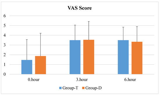 VAS scores did not differ between the groups in all evaluated time periods (0 h, 3 h, and 6 h postoperatively) (p > 0.05) (Figure 3).