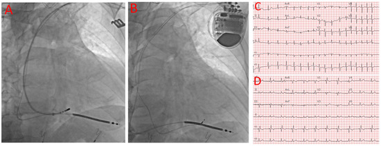 LBBAP was successful for 22 out of the 24 patients (92% in total, 20 patients had an LBBP and two patients likely had an LBBP), followed by AVN ablation from left axillary vein access in all but three patients who required the standard right femoral approach. As shown in Table 1 for the baseline characteristics, the average age of our patients was 78 ± 5 years old. The majority were female patients (63%). All the patients presented with longstanding persistent AF with multiple comorbidities and multiple medications for either rate control or rhythm control. No RA lead was implanted considering the unlikelihood of a spontaneous conversion back to a sinus rhythm. The average pre-procedure LVEF was 44 ± 14%. Six out of the 24 patients (25%) had severely reduced LVEF values of less than 35%, and these patients underwent CRT-D implantations with an LBBAP. LBBAP instead of CS pacing was chosen for the patients with an EF < 35% because these patients did not have baseline left bundle branch blocks and CS pacing was previously not shown to improve the outcomes in patients with a narrow QRS [14,15]. Four out of the 24 patients (17%) presented with an LVEF greater than 35% but less than 50%, and these patients received an RV pacing lead, in addition to LBBAP, for cardiac resynchronization therapy. The rest of the patients (14 patients, 58%) also received RV pacing leads as backup leads in case of LBBAP failure and the potential future indication of cardiac resynchronization therapy. Overall, no significant changes in QRS duration were observed before and after the ablation, with the before-and-after-procedure QRS durations being 117 ± 32 ms vs. 123 ± 14 ms. A further analysis showed a significant reduction in a QRS duration > 20 ms in five patients (21%) who had a baseline QRS duration > 140 ms, while nine patients (37.5%) demonstrated a slightly increased QRS duration >10 ms, with a baseline QRS duration < 100 ms. Figure 1C,D shows the ECG before and after the procedure.