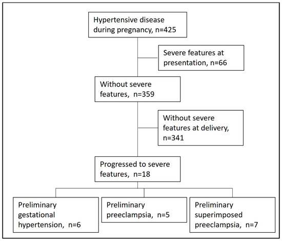 Overall, during the study period, there were 13,714 deliveries. Of them, 425 (3%) had a diagnosis of any hypertensive disorder during pregnancy; 66 presented initially with sPE and thus were excluded from the analysis. Among the remained 359 women, 18 (5%) progressed to sPE (Figure 1).