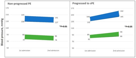 A review of the blood pressure indices at first admission demonstrated no significant statistical differences between groups. Nevertheless, visualization of measurements in gravidas with recurrent admissions demonstrated a trend toward increased blood pressure indices between the first and following admission as a marker for progression to sPE (Figure 2).
