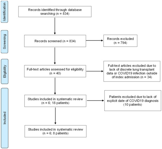 A total of 40 records were identified and eligible for full-text review. After reviewing for eligibility, we found two case series and four case reports of patients with COVID-19 infection in the immediate post-operative period (within index admission) after lung transplantation, totaling 18 patients [1,2,3,4,5,6]. However, 10 of these patients did not have explicitly reported COVID-19 diagnosis dates, were infected outside of the immediate post-operative period, or had insufficient data reported and were excluded from this analysis. All literature included in the current systematic review was published from 2020 to 2022. This literature is summarized in Table 1. A manual search of references did not identify any additional studies.