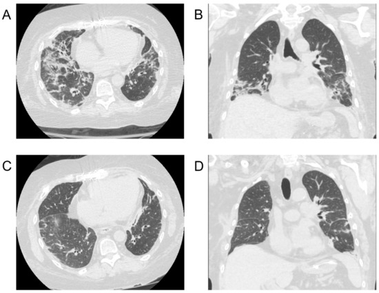 Case 4. CT scans of SARS-CoV-2 infection. (A) Axial image 18 days after diagnosis; bilaterally moderate patchy ground glass opacities in the lower lobes. (B) Coronal image 18 days after diagnosis; bilaterally moderate patchy ground glass opacities in the lower lobes. (C) Axial image 52 days after diagnosis demonstrating exceptional recovery of lung parenchyma. (D) Coronal image 52 days after diagnosis demonstrating exceptional recovery of lung parenchyma.
