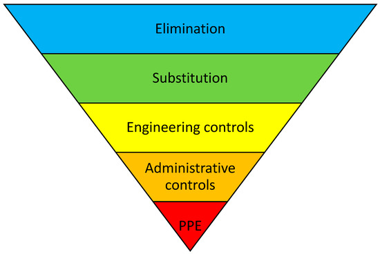 - Hierarchy of Controls. The National Institute for Occupational Safety and Health (NIOSH). 2015. Available online: https://www.cdc.gov/niosh/topics/hierarchy/default.html (accessed on 5 July 2023).