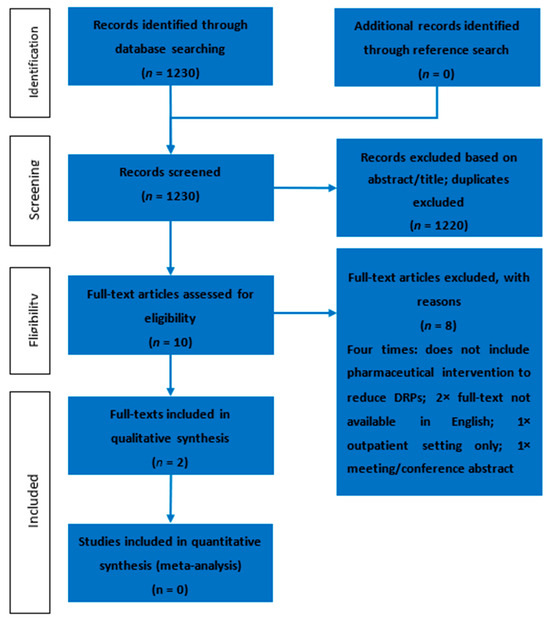 After screening 1230 abstracts, 10 full texts were eligible for further full-text screening, according to the exclusion criteria (Figure 2). Of these 10 full texts, only two described pharmaceutical interventions with which to reduce DRPs in an experimental context and, thus, were included in this review (Table 1). The interrater agreement between the two researchers to include or exclude an abstract was calculated via the weighted Cohen’s κ. This resulted in a coefficient of 0.57, which is a “moderate” agreement, according to the nomenclature.