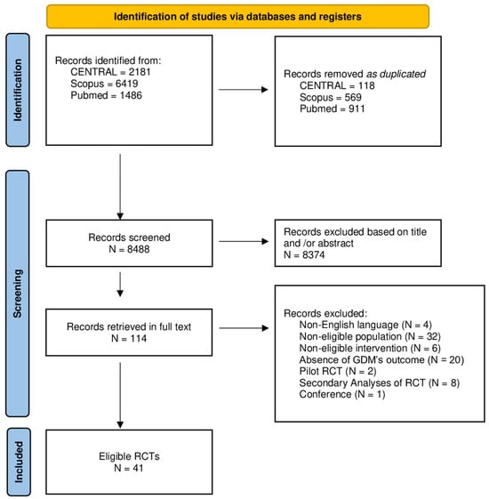 The search yielded 10,086 items (2181 in CENTRAL, 6419 in Scopus, and 1486 in PubMed). A total of 1598 items were excluded as duplicated. Out of the 8488 remaining items, 8374 were excluded as non-relevant based on the title, or abstract. Thus, 114 papers were retrieved in full text. Out of the 114 articles, 73 were excluded: 4 studies were published in a non-English language; 32 studies did not include an eligible population; 6 studies included a non-eligible intervention; 20 trials did not report the onset of GDM as an outcome; 2 papers reported a pilot RCT; 8 papers included secondary analyses of RCTs; and 1 paper was retrieved from a conference. Finally, this study included 41 eligible published RCTs. Specifically, 10 of them reported diet-only interventions, 13 exercise-only interventions, and 18 diet-plus-exercise interventions (Figure 1).