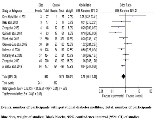 After drop-out, a total of 3109 (1530 in intervention, and 1579 in control groups) pregnant women with high risk for GDM receiving dietary intervention were analyzed for GDM outcome. Among them, 553 (17.8%) developed GDM (241 (15.7%) in the intervention group, and 312 (19.7%) in the control group). Combining studies, heterogeneity across them was significant (Q 21.29, p-value 0.01), and variability was large (I2 58% (95%CI 10, 78%)). Therefore, an RE model was selected for synthesizing the effect of dietary interventions. Women receiving nutrition intervention during pregnancy were less likely to develop GDM compared with women following standard prenatal care; however, the result of the MA was marginally not significant (OR 0.73, 95%CI 0.51, 1.03; p-value 0.07) (Figure 2).