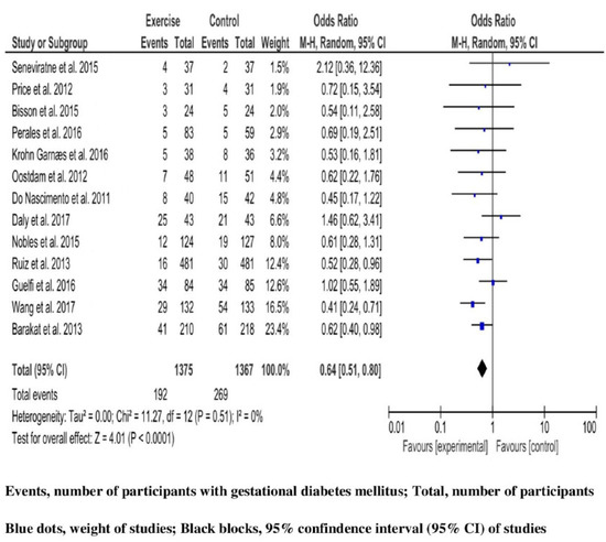 Exercise intervention and the risk of gestational diabetes mellitus in high-risk pregnant women. Meta-analysis of eligible studies with random effect model. Studies are presented according to their weight contributing to the synthesis-blue dots. Estimates of odds ratio (OR) with 95% confidence interval (95% CI) of each trial-black blocks, and overall OR with measures of heterogeneity [46,47,48,49,50,51,52,53,54,55,56,57,58].