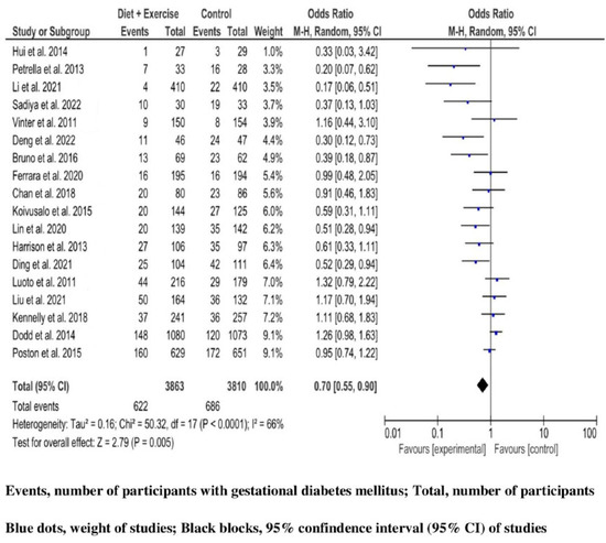 Finally, among 7673 (3863 in the experimental group, and 3810 in the comparator group) high-risk pregnant women analyzed for GDM undergoing both diet and exercise intervention, 1308 cases (17%) were diagnosed with diabetes of pregnancy (622 (16.1%) in the intervention group, and 686 (18%) in the control group). The combined studies were analyzed by an MA with RE in the presence of significant heterogeneity (Q 50.32, p-value < 0.0001, and large variability (I2 66%, (95% CI 44, 79%)). Women in the group of mixed lifestyle intervention had a significant reduction in GDM incidence (OR 0.70, 95%CI 0.55, 0.90; p-value 0.005). (Figure 4).