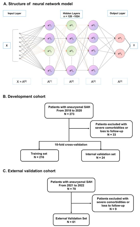 Overview of the neural network and flowchart of patient selection. (A) A FCNNs model with 3 hidden layers and varying numbers of neurons (128, 256, 512, or 1024). Linear transformations, ReLU activations, dropout (green neurons), and sigmoid/softmax outputs were adopted to automatically learn nonlinear relationships from data for prediction. (B) Cohort for model development. (C) External validation cohort for scorecard model.