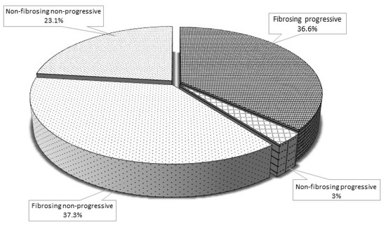 Globally, a fibrosing progressive pattern was recorded in 36.6% of patients (49/134, 48.5% of patients with fibrosing pattern). In particular, 54.4% of patients with a UIP pattern, 30.8% of patients with NSIP, and 10% of patients with other HRCT ILD patterns showed a fibrosing progressive pattern (Table 2).