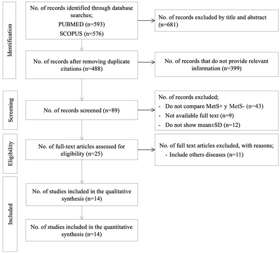 This systematic review and meta-analysis were conducted according to the criteria established by the PRISMA statement [17] (Supplementary Materials). The search was performed in the PubMed and Scopus databases, covering January 2017 to January 2022. The search methodology was formulated by amalgamating the following Medical Subject Headings (MeSH) descriptors: “metabolic syndrome”, “leukocytes”, and “white blood cells” with the Boolean operator AND. Cross-sectional and longitudinal studies investigating the association between MetS and leukocytes or articles collecting data related to both parameters were included. In addition, the results had to include the mean and standard deviation. Only manuscripts in English and Spanish and those collecting data on subjects older than 18 years were considered. Papers from subjects previously diagnosed with diabetes, obesity or active infections that could increase the level of leukocytes in their study groups were excluded. The systematic review was registered in PROSPERO with ID CRD42022228327.