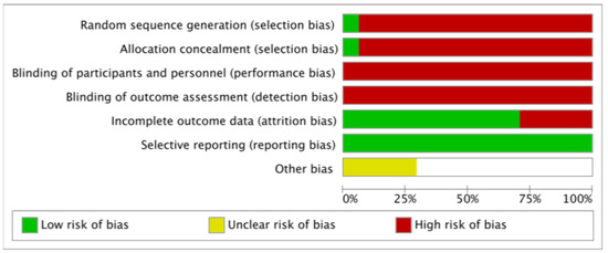 Overall (Figure 2), it can be seen that the main biases were random sequential generation, allocation concealment, blinding of participants and personnel, and blinding of outcome assessment. Only one of the included articles collected data randomly with allocation concealment [30]. Figure 3 represents the individual assessment of the included studies.